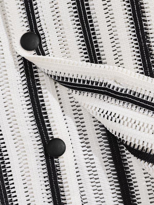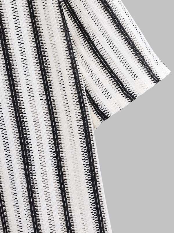Una prenda que nunca pasa de moda. Esta camisa de manga corta con rayas verticales en blanco y negro combina simplicidad con un toque moderno. Su diseño limpio la convierte en una opción versátil, ideal para looks casuales, urbanos o incluso para una salida elegante con un toque relajado.
